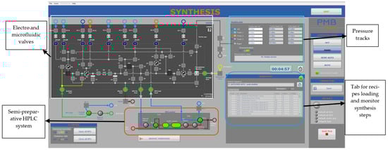 All synthesis steps were performed by iMiDEV™ supervision (human–machine interface-HMI) software. The HMI (Figure 2) allows synthesis in different modes, such as manual, semi-automated, and fully automated. The automated mode performs all synthesis steps, including radiochemistry, HPLC purification, and the final product formulation.