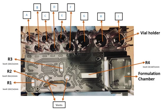 iMiDEV™ microfluidic cassette: Reactors (R1–R3 for reaction and R4 for SPE purification) and vial’s positions (A to F for 4 mL vials and G to I for 15 mL vials).