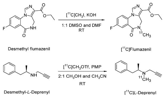 Reaction schematic for [11C]flumazenil and [11C]L-deprenyl synthesis.