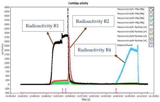 The displacement of radioactivity in the cassette was detected from the sensors above R1, R2, R3, and R4 and monitored throughout the synthesis. This is shown in Figure 6. The product activity was measured using a dose calibrator, and the vial was weighed to calculate the total volume of the product. Quality control (QC) tests were performed to assess the radiochemical purity and identity of the final product.