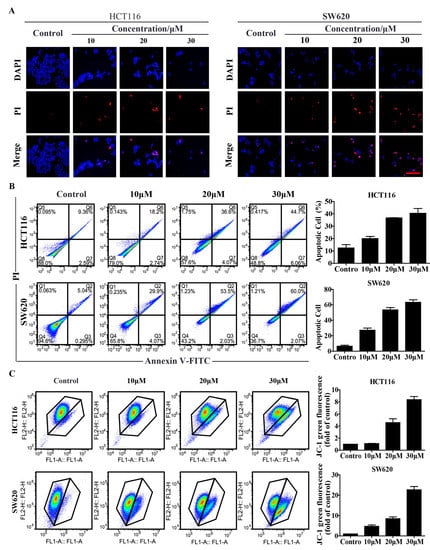 Compound 9r induces apoptosis in colorectal cancer cells. (A). Cell death induced by compound 9r was observed with a fluorescence microscope after DAPI and PI staining. HCT116 and SW620 cells were treated with indicated concentrations of compound 9r for 24 h. Cells exhibiting red fluorescence indicated apoptosis or necrosis, the cell nucleus was stained with DAPI. Scale bar represents 100 μm. (B). Apoptosis was measured and analyzed via flow cytometry using Annexin V-FITC/PI staining. Cells were treated with the indicated concentration of compound 9r for 48 h. Bar figure represents the apoptotic rate. Data are represented as mean ± SD (n = 3). (C). The mitochondrial membrane potential was measured by flow cytometry using JC-1 staining. Cells were treated with the indicated concentrations of compound 9r for 24 h. Results indicating the intensity of green fluorescence are shown as fold changes from control from three independent experiments. Data are represented as mean ± SD (n = 3). DAPI: 4′, 6-diamidino-2-phenylindole.