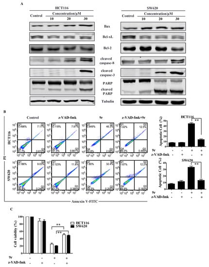 Compound 9r induces apoptosis through caspase-dependent pathways. (A). The expression of apoptotic proteins (Bax, Bcl-xL, Bcl-2, cleaved caspase-8, cleaved caspase-3, PARP and cleaved PARP) was measured using Western blotting, α-Tubulin was used as loading control. Cells were treated with the indicated concentrations of compound 9r for 48 h. (B). Apoptosis was measured by flow cytometry using Annexin V-FITC/PI staining. General caspases inhibitor z-VAD-fmk pretreatment reserved compound 9r-induced apoptosis in HCT116 and SW620 cells. Cells were pretreated with 50 μM z-VAD-fmk for 2 h before being exposed to 30 μM compound 9r for 48 h. Bar figure represents the apoptotic rate of indicated compound treatment. Data are represented as mean ± SD (n = 3). Significance was tested by Student’s t-test (** p < 0.01). (C). Cell viability of compound 9r-treated HCT116 and SW620 cells. Cells were preincubated with 50 μM z-VAD-fmk for 2 h before treatment with 30 μM compound 9r for 24 h, and the cell viability was measured by MTT assay. Data are demonstrated as the mean ± SD (n = 3). Significance was tested by Student’s t-test (** p < 0.01).