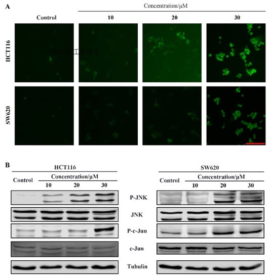 The accumulation of ROS in cells leads to oxidative stress, which activates the c-Jun N-terminal kinase (JNK) pathway. We want to know whether compound 9r activated the JNK pathway in colorectal cancer cells. Human colorectal cancer HCT116 and SW620 cells were treated with different concentration of compound 9r for 24 h and subjected to Western blot assay. The results show that, as the concentration of compound 9r increased, the phosphorylation of JNK and its substrate c-Jun was elevated (Figure 4B), which means that JNK pathway was activated. These results indicate that compound 9r induces ROS production, which activates JNK pathway.
