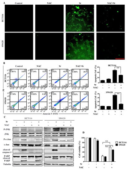 To find out whether compound 9r-triggered apoptosis was ROS dependent, we used antioxidant agent N-acetylcysteine (NAC) to block ROS generation. The fluorescent images show that compound 9r-induced ROS production was completely blocked by NAC (Figure 5A). Accordingly, compound 9r-triggered apoptosis in HCT116 and SW620 cells was suppressed by NAC (Figure 5B). The compound 9r-activated JNK pathway and caspase pathway were also inhibited by NAC (Figure 5C). Finally, the decrease in compound 9r-induced cell viability was reversed by NAC in HCT116 and SW620 cells (Figure 5D). All these data imply that compound 9r induces ROS generation, which activates the JNK pathway and caspase pathway, and finally, the activation of the JNK pathway and caspase pathway results in apoptosis.
