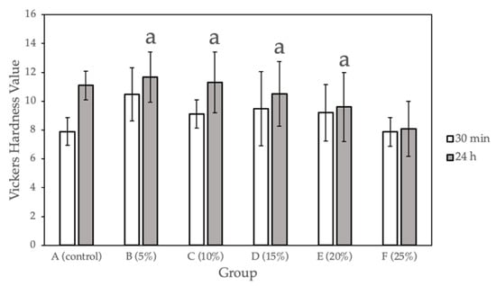 Vickers hardness for self-cure PMMA with various Gantrez concentrations (n = 12). Note: means with letter “a” did not have a statistically significant difference (p > 0.05) compared to their respective controls.