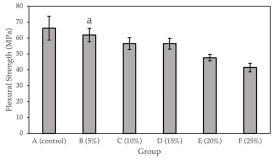 Flexural strength for self-cure PMMA with various Gantrez concentrations (n = 12). Note: the letter a represents the absence of a statistically significant difference between the mean of the sample group compared to the flexural strength control (p > 0.05).