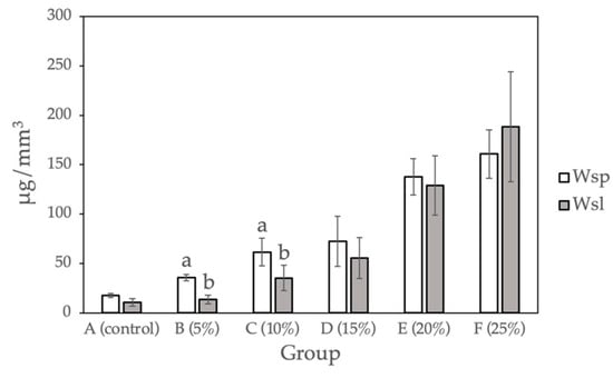 Figure 3 and Table 3 show the water sorption and water solubility calculated for the sample groups (0%, 5%, 10%, 15%, 20%, and 25%). Compared with the control group, a statistically significant difference (p < 0.05) was observed for Groups D to F (15%, 20%, and 25% Gantrez). There is no significant difference between Group B and C (5% and 10% Gantrez). Group F (25% Gantrez) showed the highest water sorption (160.92 μg/mm3) and solubility (188.51 μg/mm3). As the concentration of Gantrez decreased, the experimental values decreased to the lowest water sorption (17.40 μg/mm3) and water solubility (10.60 μg/mm3) values for group A (control).