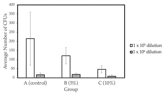 The bacterial viability (CFU mg-1) for the three different concentration groups- A (control), B (5% Gantrez), and C (10% Gantrez)- were tested at dilutions of 1 × 105 and 1 × 106. Groups D (15% Gantrez) and E (20% Gantrez) were not tested in this study because of the impaired flexural strength properties demonstrated by the prior physical tests. In addition, Group F (25% Gantrez) was not tested because it showed both impaired flexural strength and Vickers hardness. Dry weight values (g) were calculated for the three groups (Control, 5% Gantrez, 10% Gantrez), and the control group had the highest dry mass value (Table 4). Overall, the microbiology tests revealed that there was a significant decrease in the number of colonies as the concentration of Gantrez increased (Figure 4).