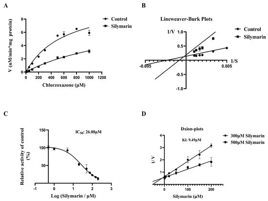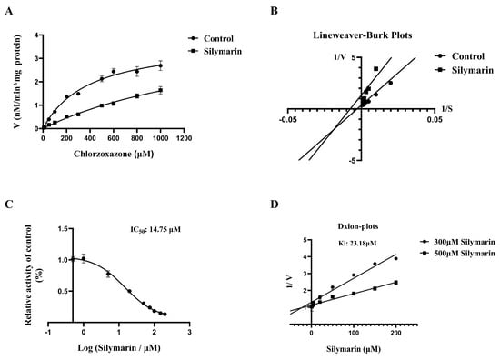 To obtain the inhibition index (Ki) of SM on CYP2E1 in microsomes, 300/500 μM CLX with HLMs/RLMs was incubated with 1–200 µM silymarin at 37 °C for 30 min. Inhibition data were plotted as Dixon plots, and the inhibition constant (Ki) was calculated from the regression equation.