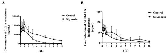Average plasma concentration–time curves of CLX (A) and 6-OH-CLX (B) in the solvent control (4% HP-β-CD (w/v)) and SM (45 mg/kg) groups after a single oral dose of 30 mg/kg CLX. The data are presented as the means ± SDs, n = 6.