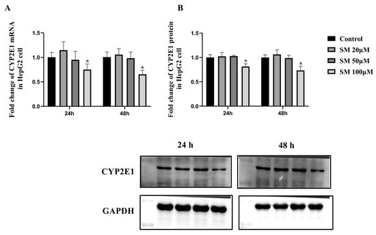 The mRNA expression (A) and protein expression (B) levels of CYP2E1 in HepG2 cells after 24 h or 48 h of treatment with different concentrations of SM. The mRNA and protein expression levels of CYP2E1 were normalized to those of GAPDH. The data are presented as the means ± SDs, n = 3. * p < 0.05 compared with the control group.