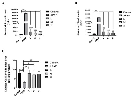 The levels of serum ALT (A), AST (B), and liver reduced GSH (C) in normal (pre-treated with solvent) and ALI (pre-treated with SM) mice. Series dosages of 35, 50, and 65 mg/kg were noted as L, M, and H, respectively. The data are presented as the means ± SDs, n = 6. ** p < 0.01, *** p < 0.001 compared with the control group; # p < 0.05, ## p < 0.01, ### p < 0.001 compared with the APAP group.