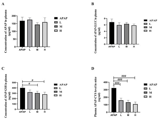 Plasma concentrations of APAP (A), APAP-gluc (B), APAP-GSH (C), and APAP-CYS (D) in ALI (pre-treated with SM) mice at 6 h after APAP administration. Series dosages of 35, 50, and 65 mg/kg were noted as L, M, and H, respectively. The data are presented as the means ± SDs, n = 6. # p < 0.05, ### p < 0.001 compared with the APAP group.