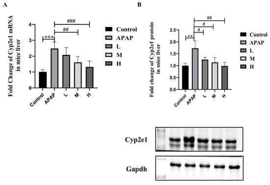 The mRNA expression (A) and protein expression (B) of Cyp2e1 in normal (pre-treated with solvent) and ALI (pre-treated with SM) mice. Series dosages of 35, 50, and 65 mg/kg were noted as L, M, and H, respectively. The mRNA and protein expression levels of Cyp2e1 were normalized to Gapdh. The data are presented as the means ± SDs, n = 6. ** p < 0.01, *** p < 0.001 compared with the control group; # p < 0.05, ## p < 0.01, ### p < 0.001 compared with the APAP group.