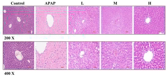 Representative micrographs of H&E-stained liver right lower lobe sections from normal (pre-treated with solvent) and ALI (pre-treated with SM) mice. Series dosages of 35, 50, and 65 mg/kg were noted as L, M, and H, respectively. (200× and 400× magnifications).