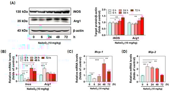 The enzymes inducible nitric oxide synthase (iNOS) and arginase-1 (Arg1) are commonly used as specific phenotypic molecules for macrophage polarization []. In the present study, western blotting and real-time qPCR were performed to verify the effects of acute arsenic exposure on macrophage differentiation in the liver. As shown in Figure 1A,B, our data suggested that acute arsenic exposure time-dependently up-regulated protein expression of iNOS and Arg1 after 48 h. Simultaneously, treatment with the metalloid increased the gene expression of Inos after 48 h, while the transcription of gene Arg1 started earlier, at 6 h. As key chemokines, MCP-1 and MIP-2 play vital roles in recruiting immune cells to pathologic sites, indirectly reflecting progress and regress of inflammation [,]. As shown in Figure 1C,D, our data showed that gene expression of Mip-2 was drastically up-regulated upon acute arsenic exposure, and peaked at 6 h, which was 2.43 folds that of the control group. Consistent with gene expression of Inos, the metalloid also induced the gene expression of Mcp-1, which peaked at 48 h.