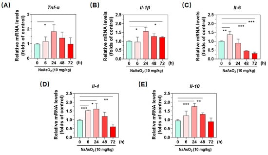 Accompanied with up-regulated phenotypic molecules and chemokines, one additional peculiarity of macrophages is that they release a plethora of cytokines to communicate with other cells, thereby orchestrating immune responses. Next, we examined effects of the metalloid on gene expression of inflammatory cytokines by using real-time qPCR. As shown in Figure 2A–C, our data indicated that treatment with acute arsenic exposure time-dependently up-regulated transcription activity of the proinflammatory cytokines Tnf-α and Il-β in liver, which both peaked at 24 h (Figure 2A,B). Similarly, the metalloid induced the gene expression of Il-6 at 6 h, then time-dependently decreased till 72 h (Figure 2C). After having confirmed up-regulation of proinflammatory cytokines, we next detected the expression of anti-inflammatory cytokines. Analogously, acute oral administration of arsenite also activated the transcription of genes Il-4 and Il-10. In particular, the gene Il-10 was 1.82 folds that of control group at 24 h. Together with all above results, we confirmed the hepatic macrophage polarization after a single oral administration of NaAsO2.