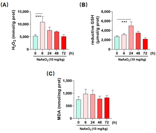 Imbalanced redox homeostasis in the liver of acute arsenic-exposed mice. (A–C) redox-related indexes H2O2, GSH and MDA in the liver were detected by biochemical kits at different time points after an oral administration of NaAsO2. Data are presented as mean ± SD (n = 4). *** denotes p < 0.001 compared with Control (0 h) group.