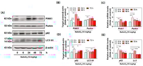 After having confirmed acute inorganic arsenic-induced hepatic redox imbalance and subsequent macrophage polarization in the liver, we ruminated about how to seek effective molecule targets to ameliorate arsenical oxidative and immune toxicity. Based on these considerations, we found that PINK1/Parkin-mediated mitophagy could effectively clear damaged mitochondria, preventing mtROS from bursting and provoking cascaded inflammation in the entire cells []. Consequently, western blotting and real-time qPCR were performed to detect hepatic protein expression of PINK1/Parkin-mediated mitophagy. As shown in Figure 4A–E, we observed the highest expression of PINK1 and Parkin at 24 h, which were 1.96 and 1.28 folds that of the control group, after the single oral administration of NaAsO2 (Figure 4A,D). Accompanied with the upregulation of PINK1 and Parkin, autophagy-related protein p62 and LC3 II/I were also verified to increase both at 6 and 72 h (Figure 4A,D). Consistently, mRNA levels of Pink1, Parkin, p62 and Lc3 were confirmed to increase in the liver at 6 or 24 h, after the treatment with the metalloid (Figure 4C,E). These data together suggested that acute arsenic exposure activated the PINK1/Parkin-mediated mitophagy in liver.