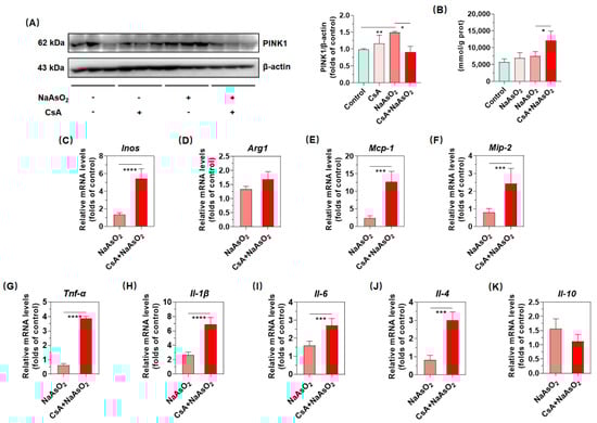 To further probe how PINK1/Parkin-mediated mitophagy exerts in inorganic arsenic-mediated hepatic macrophages polarization, we tried to constrain PINK1/Parkin-mediated mitophagy by inhibiting PINK1 expression with the pharmacological inhibitor CsA. As shown in Figure 5A, intraperitoneal injection with 10 mg/kg CsA significantly suppressed the inorganic arsenic-induced PINK1 expression and demonstrated that the pharmacological inhibition of PINK1 appeared to be conducted successfully in the livers of arsenic-exposed mice. In addition, the pharmacological inhibition of PINK1 promoted the inorganic arsenic-induced production of H2O2, which represented the anabatic redox imbalance (Figure 5B). Driven by the hypothesis that PINK1/Parkin-mediated mitophagy could resist arsenic-induced up-regulation of phenotypic molecules, chemokines and pro/anti-inflammatory cytokines, we screened above targets potentially regulated by PINK1/Parkin-mediated mitophagy. As shown in Figure 5C–G, our results denoted that restrained PINK1/Parkin-mediated mitophagy by CsA could promote arsenic-induced gene expression of Inos, Mcp-1, Mip-2, Tnf-α, Il-1β, Il-6 and Il-4, while analogous effects were not observed for Arg1 and Il-10 in liver (Figure 5D,K). Therefore, these data jointly suggested that PINK1/Parkin-mediated mitophagy might suppress the expression of Inos, Mcp-1, Mip-2, Tnf-α, Il-1β, Il-6 and Il-4, which partially protects against arsenic-induced macrophage polarization in liver.