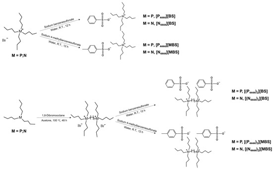 Figure 1 shows the chemical structure of (a) the cations and (b) the BS and MBS anions of the ILs analyzed in this study. This series shows the effect of structural changes, such as deformation in the monocationic and dicationic forms, the central atom in the cation (phosphonium or ammonium), and an increase in the number of methyl groups in the anion. The monocationic and dicationic structures were designed and synthesized according to the simple protocol shown in Figure 2 using modified literature procedures [60,61,62]. Monocationic compounds were obtained in one step via anion exchange, and dicationic compounds were prepared in two steps via the Menshutkin SN2 reaction and anion exchange methods.