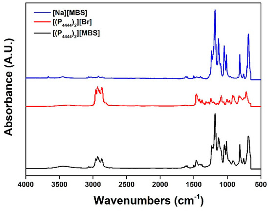 FT-IR spectra of aqueous of [Na][MBS], [(P4444)2][Br], and [(P4444)2][MBS] at room temperature.