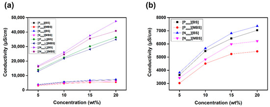 Conductivity of (a) [P4444][BS], [N4444][BS], [P4444][MBS], [N4444][MBS], [(P4444)2][BS], [(N4444)2][BS], [(P4444)2][MBS], and [(N4444)2][MBS] (b) [P4444][BS], [N4444][BS], [P4444][MBS], and [N4444][MBS] aqueous solutions according to concentration.