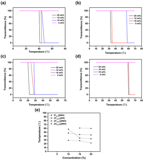 Transmittance curve of (a) [P4444][MBS], (b) [(P4444)2][BS], (c) [(P4444)2][MBS], and (d) [(N4444)2][MBS] according to the temperature change using UV-Vis spectrophotometer. (e) Phase diagram showing concentration dependence of LCST behavior of [P4444][MBS], [(P4444)2][BS], [(P4444)2][MBS], and [(N4444)2][MBS] solutions in water.