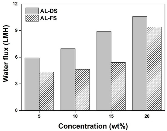 Water flux of octane-1,8-diylbis(tributylphosphonium) 2,4-dimethylbenzenesulfonate ([(P4444)2][MBS]) according to the concentration at room temperature during forward osmosis process in AL-DS mode and AL-FS mode.