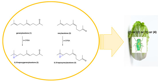 Geranylacetone and nerylacetone are natural sesquiterpenoid components of plant essential oils [33,34,35,36]. Geranylacetone is bactericidal and fungicidal [37]. Used against the higher organisms, geranylacetone had a deterrent activity to the bark beetle Ips subelongatus Motsch. (Coleoptera: Curculionidae) and a repellent activity to ticks Rhipicephalus appendiculatus Neum. (Ixodida: Ixodidae) [38,39]. Nerylacetone is an ingredient many essential oils obtained from, e.g., Paulownia tomentosa (Thunb.) (Paulowniaceae) and ginger Zingiber officinale Roscoe (Zingiberaceae), which have antibacterial activity [40,41]. Considering their broad activity, it is very likely that geranylacetone and nerylacetone may affect the behavior of the green peach aphid, especially modify its foraging activity. The effects of geranylacetone and nerylacetone on M. persicae have never been studied and remain unknown. We decided to carry out the present study to fill this gap. Moreover, knowing that structural modifications may affect the activity of the natural compounds, we also investigated the effects of related compounds, namely the epoxy-derivatives of geranylacetone and nerylacetone [42].