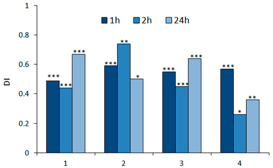Settling success of Myzus persicae on Brassica rapa subsp. pekinensis exposed to geranylacetone (1), epoxygeranylacetone (2), nerylacetone (3), and epoxynerylacetone (4). The same plant species was used to maintain the aphid stock culture. The relative index of deterrence (DI) after 1, 2, and 24 h. Asterisks indicate statistically significant differences between the numbers of aphids on control and treated leaves according to the Student t-test: * p < 0.05, ** p < 0.01, *** p < 0.001.