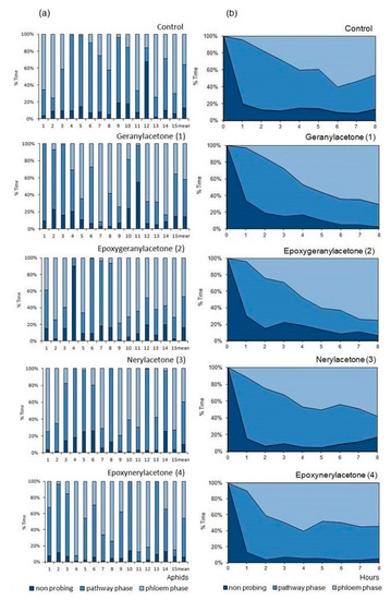 In the present study, the deterrent activity of nerylacetone, geranylacetone, and their epoxy-derivatives was examined in two independent complementary experiments, one involving freely moving aphids (aphid settling in a choice-test), the other involving tethered aphids (aphid probing behavior in the EPG no-choice test). The aim of the choice test was to show aphid preferences for the food source and the aim of the no-choice test was to explain the background of the observed preferences. The no-choice test, i.e., the 8 h continuous monitoring of aphid behavior allows the analysis of probing during the pre-ingestive (within non-phloem tissues before the first phloem phase) phase separately from the ingestive (within the phloem) phase of probing [42]. The parameters derived from the electronic registration are good indicators of plant suitability or interference of probing by chemical or physical factors, including the exogenously applied chemicals, in individual plant tissues and the association of this activity to particular phases of aphid probing [42,44,45,47,50,51,52,53]. When xenobiotics are applied exogenously, the aphids may act as sensors that indicate the transfer of these compounds from the epidermis into internal plant tissues [44,50].