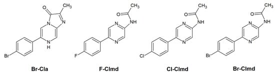 Our group has also been active in the development of novel Clz analogs with both enhanced and new properties [,,,,,,]. This effort has had a focus on the introduction of bromine (Br) heteroatoms into the imidazopyrazinone scaffold of Clz (either directly into the core, or by being part of different functional groups). Quite interestingly, this type of modification has provided some novel analogs with quite enhanced CL emission in aqueous solution when compared with native Clz [,,]. For others, the introduction of Br has provided them with anticancer activity toward different cancer cell types (prostate, breast, neuroblastoma, lung, and/or gastric cancer). Thus, it is clear that bromination is a relevant strategy in modifying Clz.