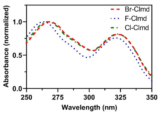 The absorption spectra of the three halogenated Clmd analogs, in aqueous solution, are presented in Figure 3. The three analogs present spectra with a very similar shape and peak position. This is particularly true for Cl- and Br-Clmd, whose spectra are composed of two peaks at ~270 and ~320 nm, with identical relative intensities between them. The absorption spectrum of F-Clmd is also similar, as it is composed of two peaks, with one of them with a maximum also at ~320 nm. However, the other peak is slightly blue-shifted (~260 nm). Moreover, it appears that the relative difference in intensity between the peaks for F-Clmd is not the same as for Cl-/Br-Clmd. Compared with the literature [,], the absorption of all halogenated compounds (red-shifted peak at ~320) is blue-shifted relative to native Clmd (335–340 nm).