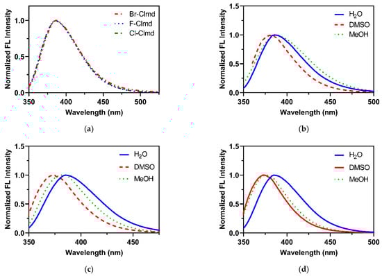 In an aqueous solution (Figure 4a), the three halogenated compounds present overlapped spectra, with an emission maximum at 385 nm. Thus, in aqueous solution, varying the halogen heteroatom does not affect the shape of the fluorescence spectra of these compounds. This emission maximum is in line with the emission typically attributed to the neutral form of native Clmd, which emits from 386 to 391 nm in benzene [] and up to 420 nm in MeOH []. This information helps us to attribute the emitted fluorescence to the neutral form (Figure 2) of F-/Cl-/Br-Clmd.