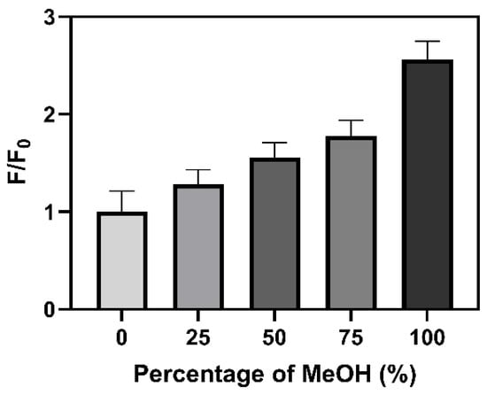 As can be seen in both Table 1 and Figure 4, while the emission wavelength of Br-Clmd is not particularly affected by the microenvironment, this is not the case regarding its QY. Thus, it is possible that this molecule could have potential to be used as a fluorescent probe for the local microenvironment by measuring the variation in its fluorescent intensity. To better assess this, we then measured the fluorescence intensity (F/F0) of a 10 μM solution of Br-Clmd with an increasing ratio of MeOH in water (from 0 to 100%, with increments of 25%). The results can be found in Figure 5. We did observe a gradual increase in fluorescence with an increasing ratio of MeOH in the solution, reaching an approximately 2.5 times increase in pure MeOH and almost two times in 25%/75% water/MeOH. Thus, the fluorescence of Br-Clmd is indeed affected by changes in the microenvironment. Given this, this type of compound has potential to be further explored as a basis for new probes for microenvironment-related parameters. Regarding the reason that this change in fluorescence intensity occurs, it should be noted that it has been previously reported that water can act as a fluorescence quencher [,,]. In fact, different fluorophores have been found to present lower QY values in water than in organic solvents [,]. Therefore, the quenching effect of water can help to explain the intensity variation here observed. Nevertheless, further research should be performed in the future to better understand this phenomenon.
