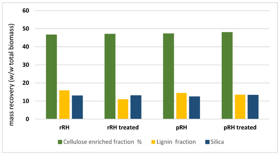 As it appears clearly from Figure 3, the weight percentages of the three fractions were almost identical for the four fractionated RHs. The cellulose-enriched fraction accounted for 47% of the total biomass in the three cases, lignin for 15.8 to 11% (for rRH and rRHT) and to 14.5 to 15.5% (for pRH and pRHT), and silica at around 13% in all cases. The results clearly prove that both the parboiling process and the autoclave treatment do not influence so much the percentages of the three main fractions and do not induce substantial differences in the natural biomass fractionation.