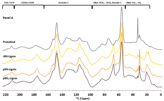 The solid-state 13C cross-polarization magic angle spinning (CP-MAS) NMR spectroscopy was used to define the fingerprint of each lignin and to highlight the structural differences among the examined samples. Figure 5 shows the superposition of the 13C CP-MAS NMR spectra of the commercial Protobind lignin with the extracted lignin samples. At first, the RHs samples had an almost overlapping profile but clearly differed from the Protobind reference sample (see Figure 5 Panel A). The region between 210 and 190 ppm corresponded to the non-conjugated carbonyl groups C=O of aldehydes. In this range of chemical shifts, there were no substantial differences among the spectra, whereas in the aromatic region (160–100 ppm), Protobind showed a lower signal intensity at 175.7 ppm compared to the other spectra. This indicated a lower presence of both –CO2H carboxylic and –CO2R ester groups. In addition, the Protobind spectrum showed another signal which was less intense than the other samples around 115 ppm, which very likely could be attributed to a lower content of the guaiacyl units.