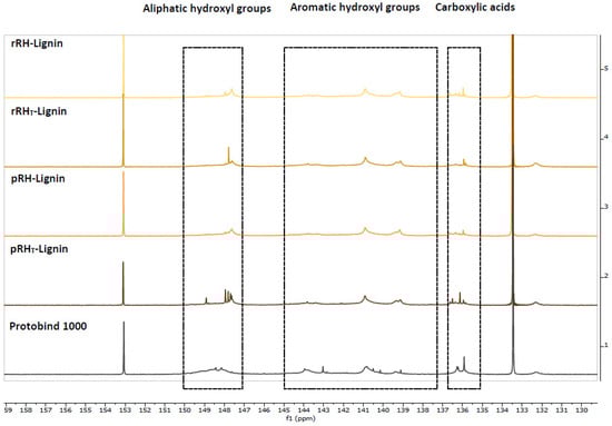 The signals of the RH-Lignins and Protobind spectra were integrated to differentiate the hydroxyl groups: the signals from 150 to 147 ppm were associated with the aliphatic hydroxyl groups, the signals from 145 to 138 ppm were related to the aromatic hydroxyl groups, and, lastly, the signals centered at 136 ppm were attributed to the carboxylic acid residues. The peak integration of these three chemical shift regions led to the quantification of the total hydroxyl groups expressed in mmol of the functional group per g of dry lignin, as reported in Table 7 below.