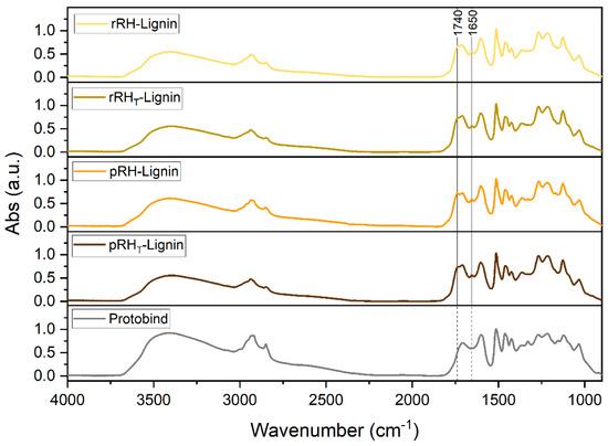 FT-IR spectra of rRH-Lignin (in pale yellow), rRHT-Lignin (in dark yellow), pRH-Lignin (in orange), pRHT-Lignin (in brown), and Protobind (in grey).