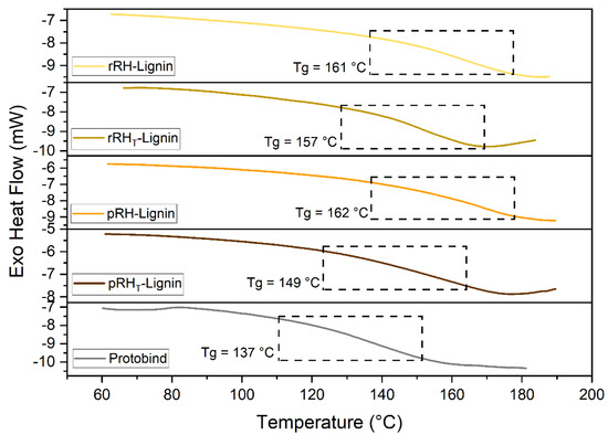 DSC scans (second heating ramp) of rRH-Lignin (in pale yellow), rRHT-Lignin (in dark yellow), pRH-Lignin (in orange), pRHT-Lignin (in brown), and Protobind (in grey).