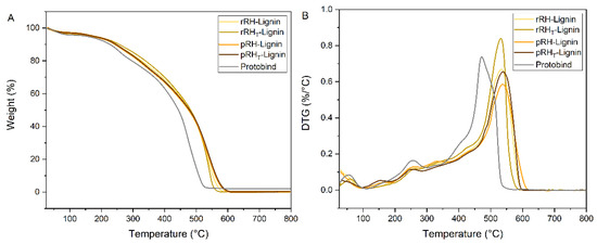 (A) TGA and (B) DTG traces of rRH-Lignin (in pale yellow), rRHT-Lignin (in dark yellow), pRH-Lignin (in orange), pRHT-Lignin (in brown), and Protobind (in grey). Analyses were conducted in air.