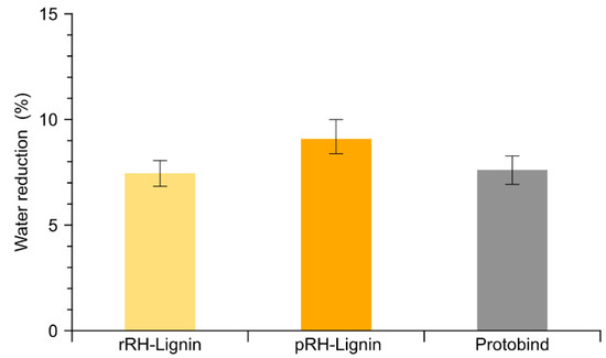 Natural lignins are a very interesting resource for the development of sustainable traditional cement water reducers. Moreover, high-performance lignin-based cement water reducers can also be developed through different types of lignin derivatization [49,50,51,52]. Typically, lignosulfonates show better water-reducing capabilities than natural lignins, but even the latter have been successfully adopted as a starting point in the development of high-performance experimental cement plasticizers. This was obtained both in the presence [53] and in the absence of sulfonation steps [49]. The DES-mediated fractionation of the lignocellulosic biomass is a mild process that results in the production of non-derivatized lignins comparable to those obtained by organosolv or soda processes. The lignins (rRH- and pRH-Lignins) obtained in the present study were thus evaluated using a commercial soda lignin (Protobind) as a reference. The measured water reduction capabilities, made by cement pastes (a blend of water and cement powder), are reported in Figure 10.