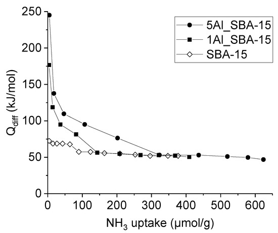 Differential heat of adsorption as a function of NH3 uptake at 80 °C for 1Al_SBA-15 and 5Al_SBA-15. For comparison, data for pure silica SBA-15 are also reported.