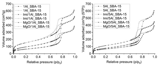 N2 adsorption (full symbols) and desorption (open symbols) isotherms for the xAl_SBA-15 supports and the Imi/xAl_SBA-15 and MgO/xAl_SBA-15 catalysts.
