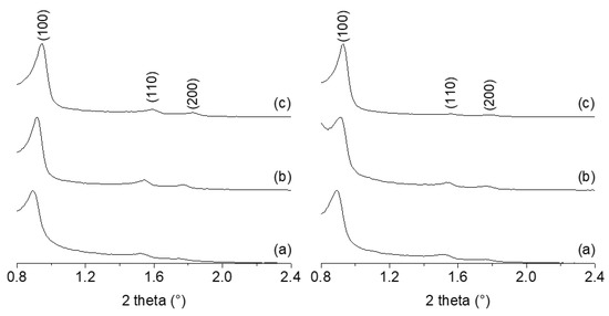 Low-angle X-ray diffraction patterns of xAl_SBA-15 (a), Imi/xAl_SBA-15 (b), and MgO/xAl_SBA-15 (c). Left: x = 1; right: x = 5.