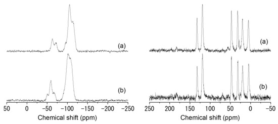 29Si (left) and 13C (right) CP-MAS NMR spectra of Imi/1Al_SBA-15 (a) and Imi/5Al_SBA-15 (b).