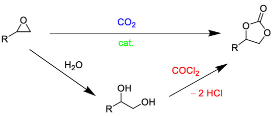 The synthesis of cyclic carbonates through the reaction of CO2 with epoxides represents a significant opportunity to transform waste into valuable chemicals while avoiding the use of phosgene (Scheme 1). This reaction is at the basis of industrial production, through which about 100 kt of cyclic carbonates are obtained per year; such value is also expected to increase, as the market of chemicals produced from cyclic carbonates (solvents, paint strippers, lithium batteries, biodegradable packaging, etc.) is constantly expanding [1,2,3].