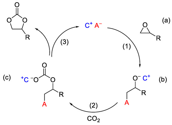 Different classes of ionic liquids, based on quaternary ammonium [12], phosphonium or pyridinium [19], or imidazolium [20] salts, have shown remarkable catalytic performance for the CO2 conversion to organic carbonates. The reaction mechanism at the basis of the catalytic activity of such ILs is depicted in Scheme 2 [21]. In the first step (1), the opening of the epoxy ring (a) occurs as a consequence of the nucleophilic attack by the anion species A−, with the resulting intermediate (b) being stabilized by the interaction with the cationic moiety. Next, the insertion of CO2 (2) leads to the formation of the (c) species, from which the formation of the five-membered cyclic carbonate occurs as a result of the elimination mechanism, thus restoring the catalytic ionic couple (C+ A−) (3). From this mechanism the prominent role of the anionic species clearly emerges, which has to be good both as a nucleophile and as leaving group (this is why halides are generally selected to obtain high performances). In addition, the role of the cationic moieties appears also important, being responsible for the stabilization of the (c) and (b) intermediates. In this regard, the presence of suitable Lewis acid species has been indicated as beneficial, due to the coordination of the oxygen at the three-membered ring, which can favor the nucleophilic attack and then the ring opening of the epoxide [22,23].