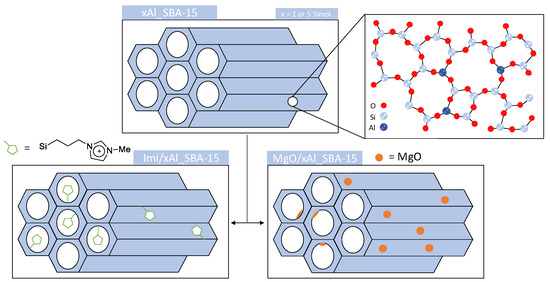 Both solids were employed as supports for subsequent functionalization. On the one hand, the silica surface was decorated with imidazolium chloride via the method using a one-pot grafting with 3-(chloropropyl)-trimethoxysilane and N-methylimidazole [55,56]. The resulting solids were denominated as Imi/xAl_SBA-15. On the other hand, both xAl_SBA-15 were impregnated with magnesium nitrate using a two-solvent method [57,58]. The materials were then calcined at 450 °C to generate MgO in the porous structure. The resulting materials were denominated as MgO/xAl_SBA-15. The experimental details for both procedures are reported in Section 3.